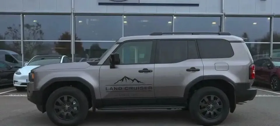 原句描述为:“车辆侧面展示,车身线条硬朗,侧面有LAND