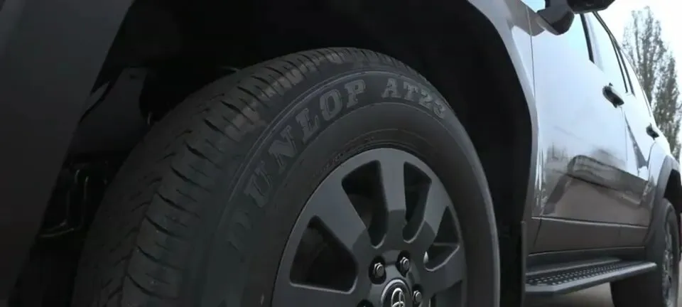 关于轮胎和轮毂,原句是:“车辆轮胎和轮毂特写,配备邓禄普轮胎,轮毂中心有丰田车标。”