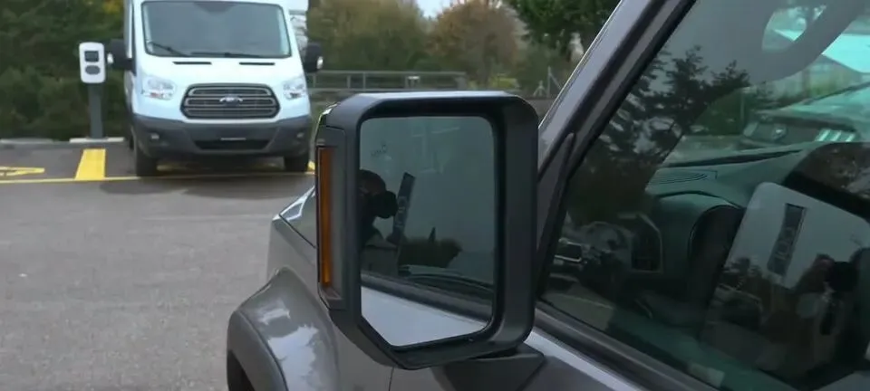 以及:“后视镜转向灯特写,采用竖条设计。”