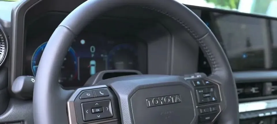原句为:“方向盘特写,配备多功能按键,中间有TOYOTA字母标识。”