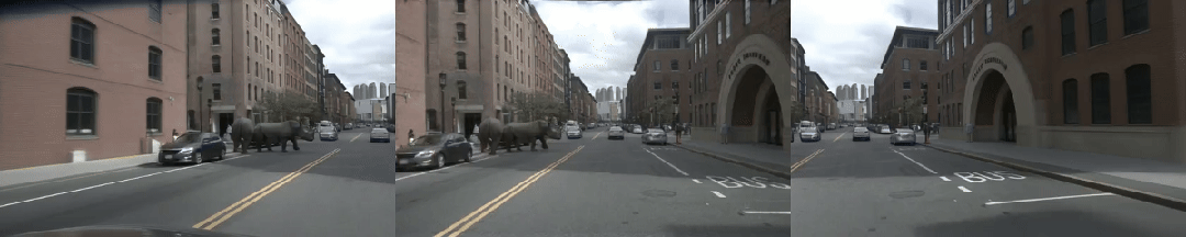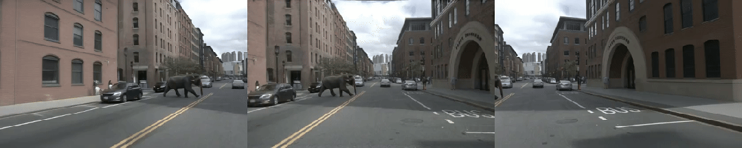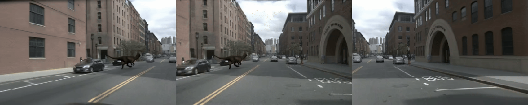 Waymo World Model 展示了在仿真中生成大象、穿着恐龙衣的行人等长尾场景的能力。NeoVerse 同样可以在真实驾驶场景中插入各类长尾物体,生成高保真的反事实视频——以下是在同一段真实驾驶视频中,分别插入大象、犀牛、恐龙后的效果: