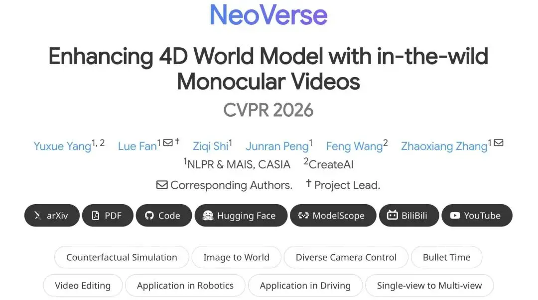 来自中科院自动化所和 CreateAI 的 NeoVerse 给出了回答:不依赖昂贵的多视角采集设备,而是从百万级互联网单目视频中学习,构建通用的 4D 世界模型,在自动驾驶仿真中实现了单目→多视角生成、长尾物体反事实场景构建、相机轨迹与焦距控制等核心能力——并且完全开源。