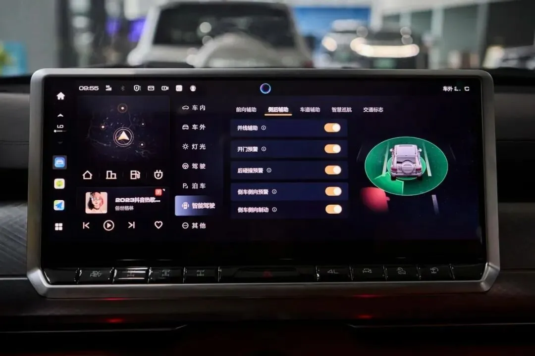 豹8的内饰比较有未来感和机械风格,皮质/真皮多功能方向盘,附带加热、记忆等功能,换挡方式为电子式挡把,方便驾驶者盲操。车机有12.3英寸全液晶仪表盘、17.3英寸中控屏、12.3英寸副驾娱乐屏、50英寸AR-HUD增强现实抬头显示系统、帝瓦雷音响等,中控屏采用的是DiLink操作系统,具备5G网络、连续性语音识别、应用下载等功能。新车全系搭载华为乾崑智驾ADS辅驾系统,辅驾硬件有1颗激光雷达的加持,像高速领航、循迹倒车、自动辅助泊车入位等功能悉数支持,水平达到了L2+级。