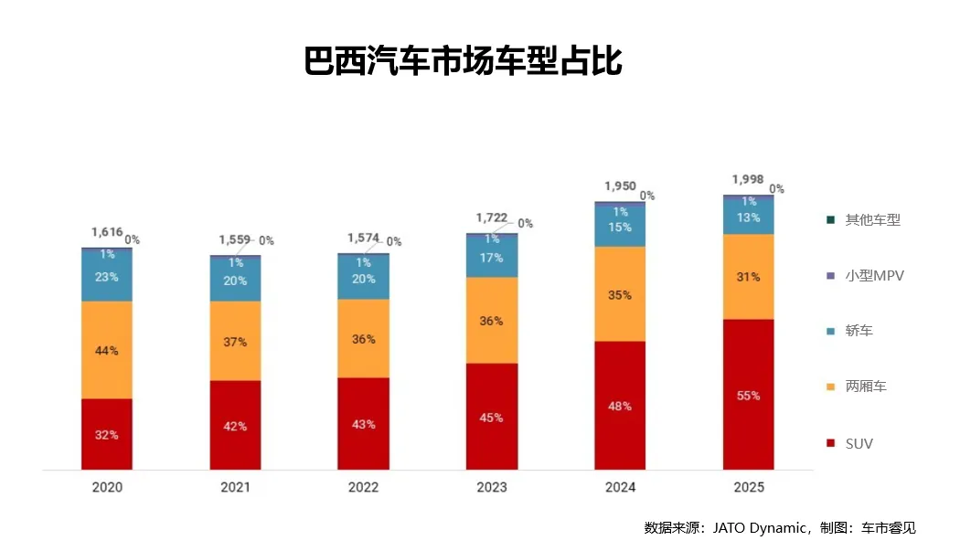 要理解当下的市场格局,必须先回看过去五年巴西消费者行为的转变。自2021年起,巴西汽车市场开启了一轮被称为“SUV化”的结构性重塑——SUV车型从小众选择迅速崛起为市场主导力量。2021年,SUV注册量首次超越轿车等传统车身类型,成为市场的转折点。到2025年,这一占比已攀升至55%,标志着市场格局的根本性改变。