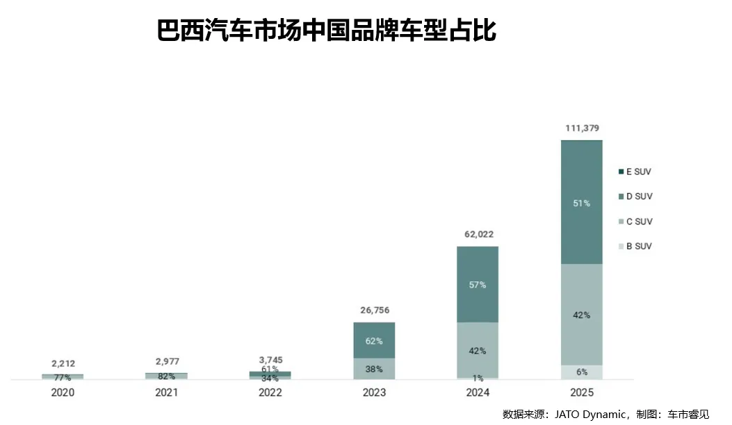 在巴西SUV市场加速向高端化演进的关键窗口期,中国品牌做出了决定性的进场。自2023年以来,中国制造SUV车型在巴西的注册量逐年翻倍,且几乎全部集中于快速增长的C级和D级高端市场——目前中国SUV注册量的93%来自这一领域。这一战略聚焦,使中国品牌能够在巴西市场增长最快、利润最丰厚的细分领域中获得最大影响力。