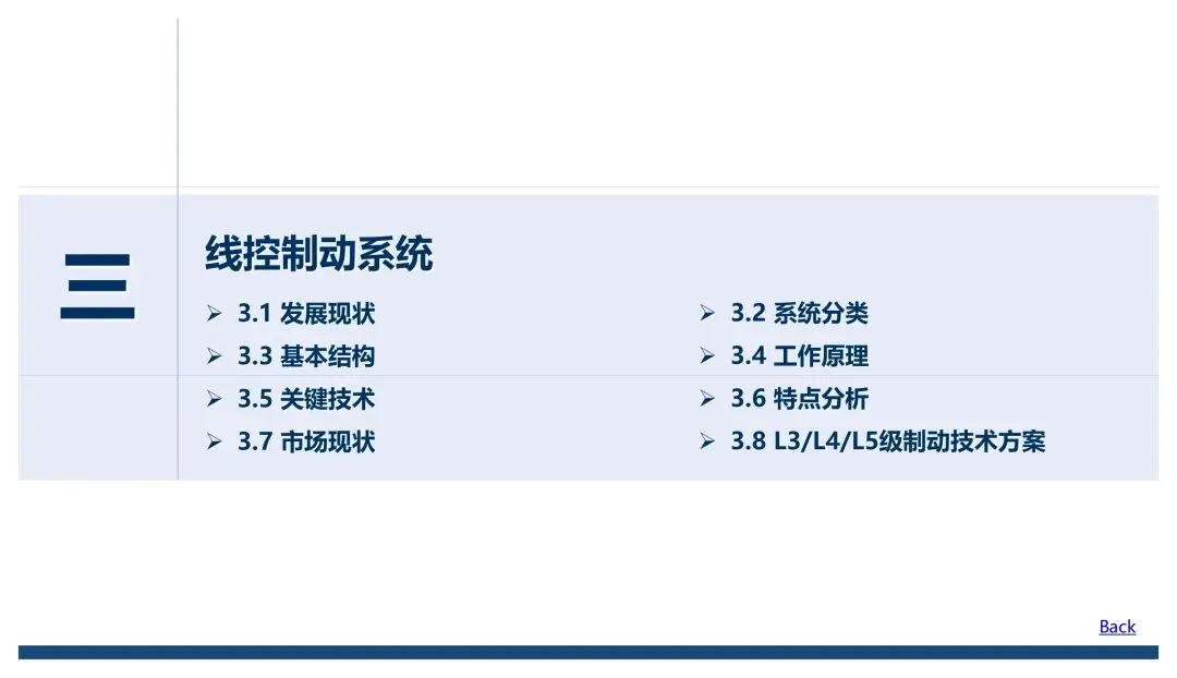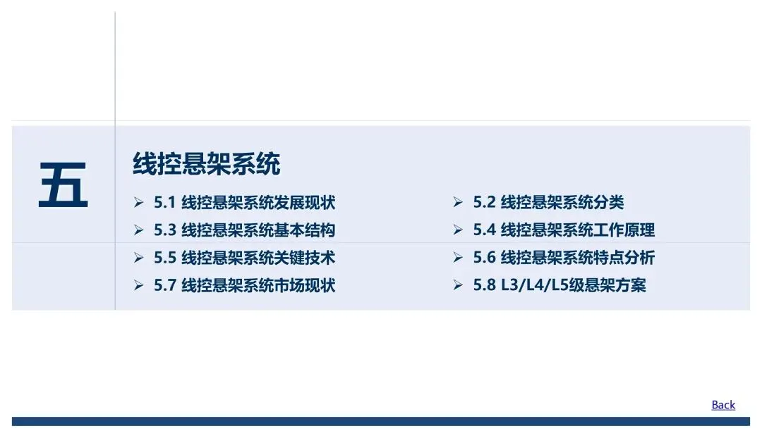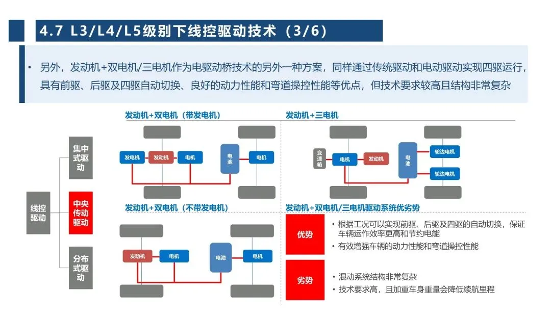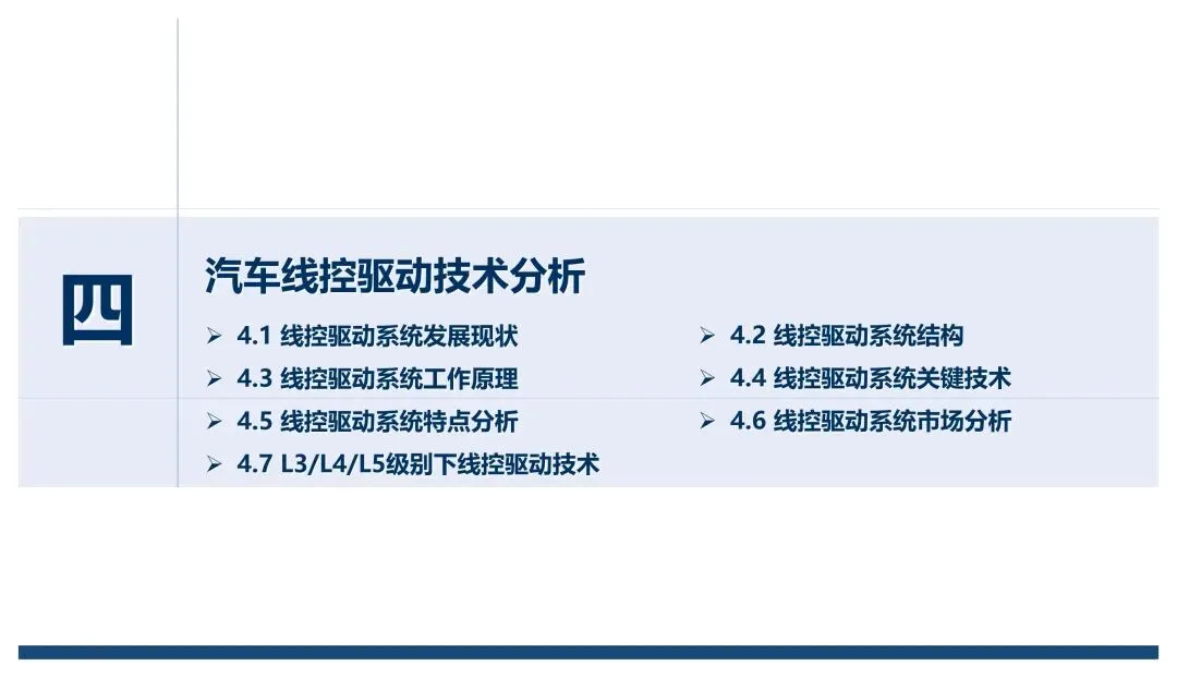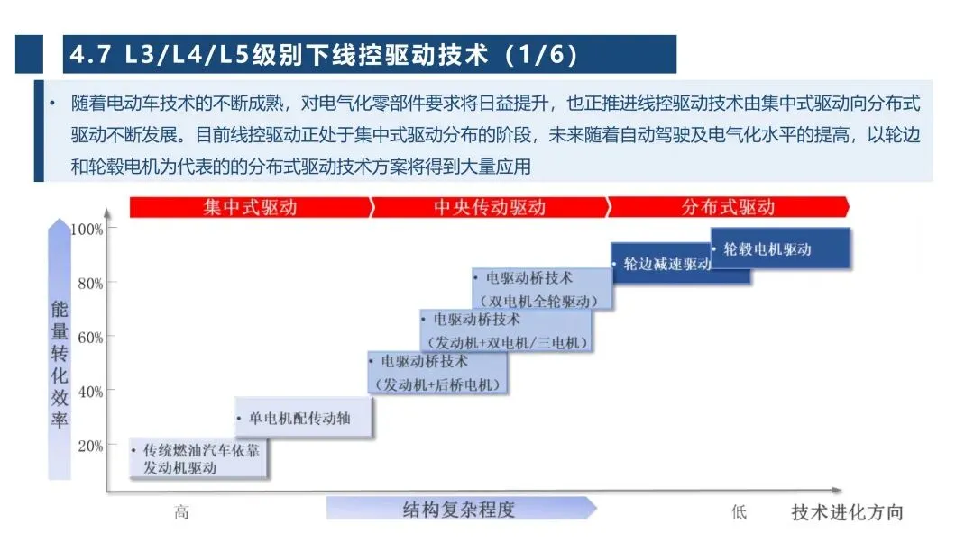 线控底盘核心由转向、制动、驱动、悬架、换挡五大子系统构成,报告把每个子系统的技术演进、结构原理、关键技术和优劣势拆解得很透彻,也明确了不同自动驾驶等级对应的技术路线差异。