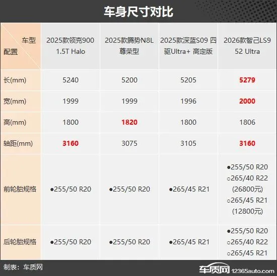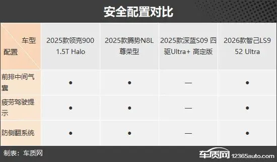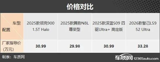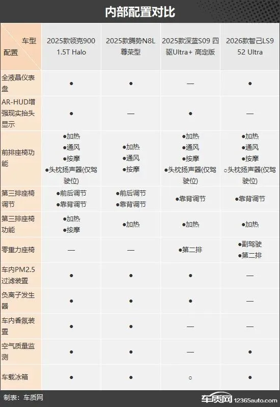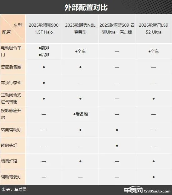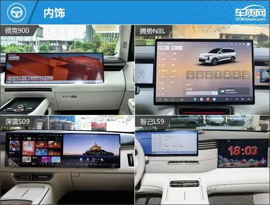 本次挑选的四款车型分别为2025款领克900 1.5T Halo(以下称:领克900)、2025款腾势N8L 尊荣型(以下称:腾势N8L)、2025款深蓝S09 四驱Ultra+ 高定版(以下称:深蓝S09)和2026款智己LS9 52 Ultra(以下称:智己LS9)。四款车型产品特点、市场定位和售价都比较接近,均能满足目标客户的多方面需求(由于目前图片数量较少,因此部分车型的图片并不是相对应的具体款型)。