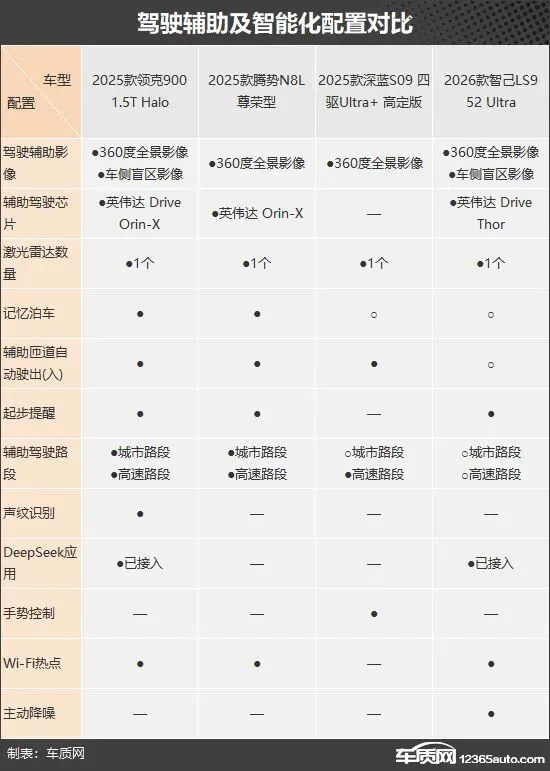智能化配置层面,领克900与智己LS9的表现相对更为突出,两款车型均已接入DeepSeek应用,这一优势是另外两款车型所不具备的。此外,领克900还独享声纹识别功能,而智己LS9的核心优势则在于配备了主动降噪功能,二者各有侧重。