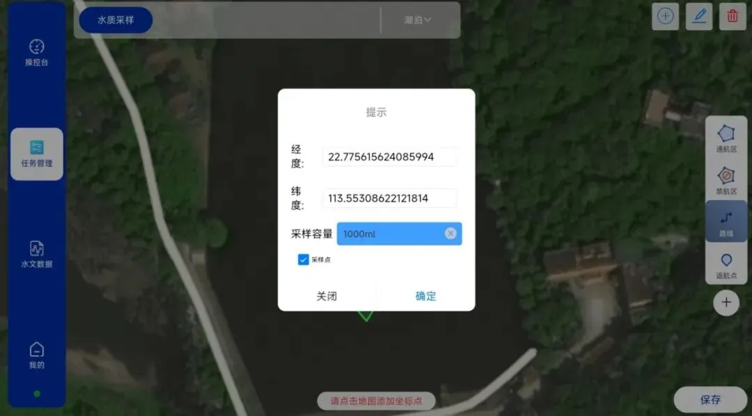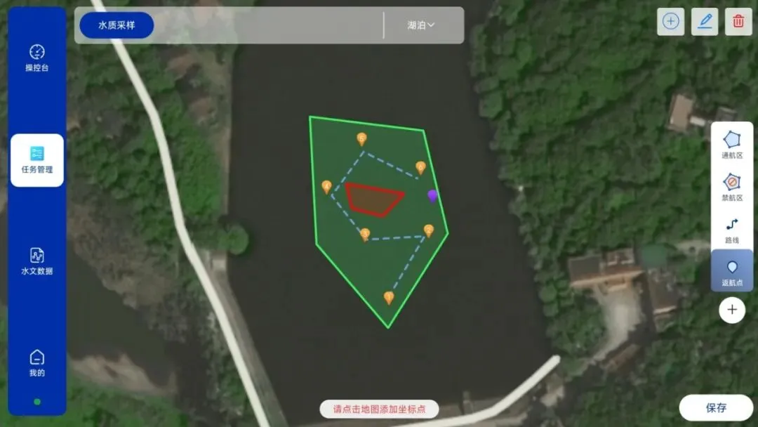 通航区设定后,客户可自主选定水域内的单个或多个无人船作业目标点,例如,在执行水质采样任务时,任务指令可能涵盖多个采样点,平台将自动记录这些已标注的点位,并生成任务的关键指令,为后续无人船自主规划任务航线提供准确依据。