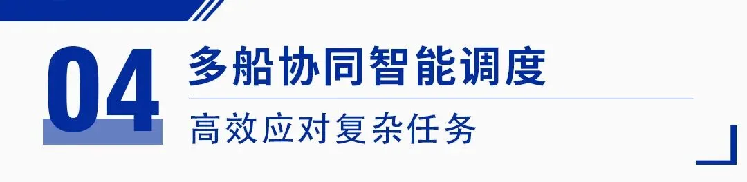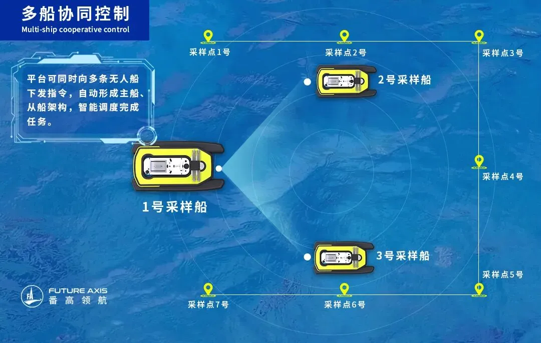 在面对广阔水域或复杂任务时,平台可向多条无人船同时下发任务指令。无人船群自动形成主船与从船的架构,由主船负责整体任务与航线的智能计算,并高效地将任务分配给从船,多船协同作业,共同完成任务。