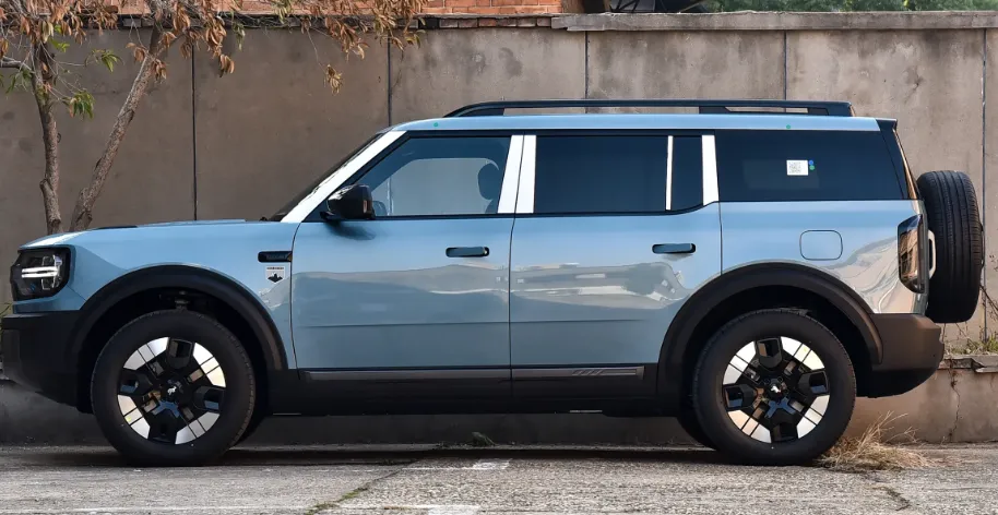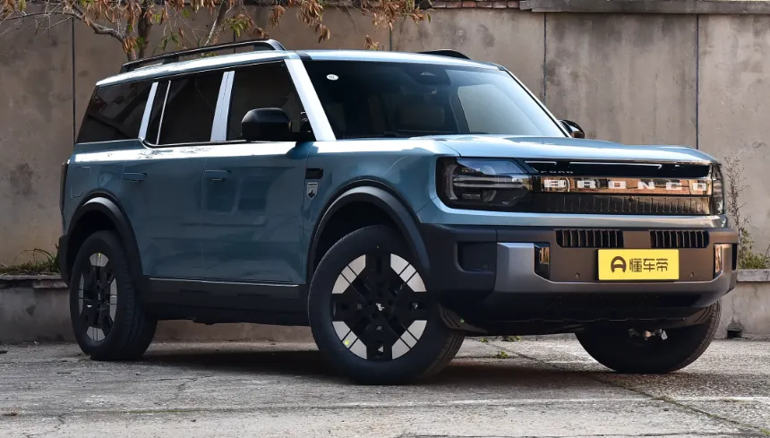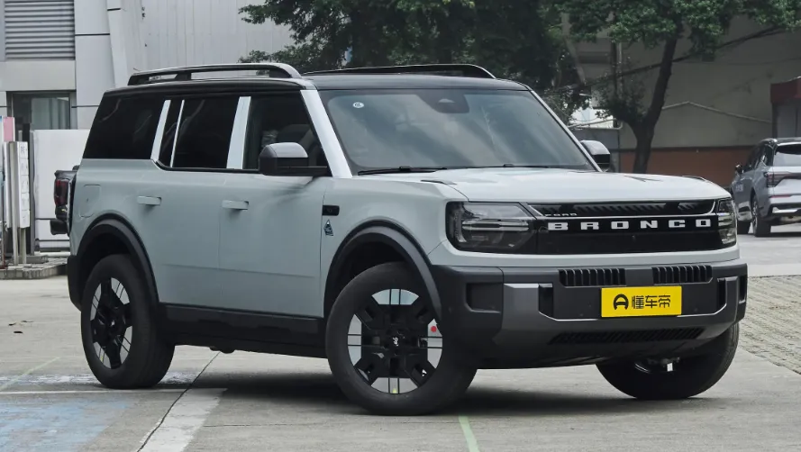 咱们先从外观开始聊哈。这车就是一个标准的方盒子造型, 车长超过5米,轴距2米95 ,站在车旁边你就能感觉到这个车的块头确实不小。然后前脸这个设计我个人是比较喜欢的,它那个 贯穿式的“BRONCO”字母是可以点亮的 ,晚上看着还挺有辨识度。