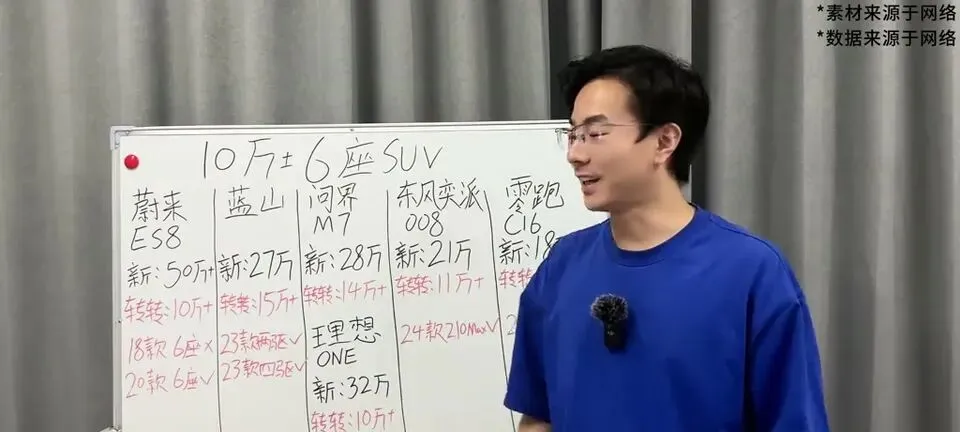 “视频总结了10万级6座SUV的选购建议,包括蔚来ES8、魏牌蓝山、问界M7、东风奕派008、理想one、零跑C16。”
