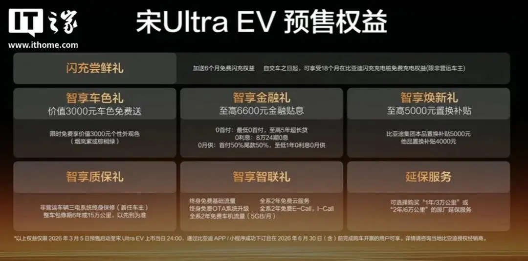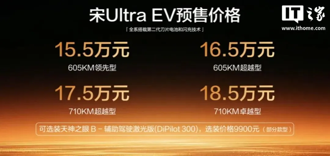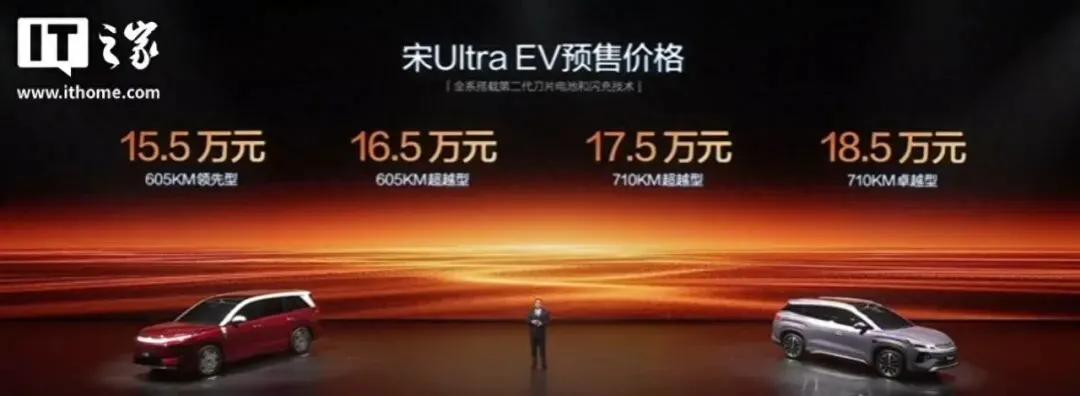 宋Ultra EV一共推出四个版本,605KM领先型15.5万,605KM超越型16.5万,710KM超越型17.5万,顶配710KM卓越型18.5万。现在下订还送18个月的免费闪充权益,等于头一年半充电不用花钱。