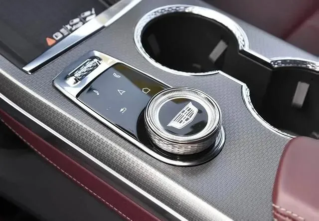 中控台那块儿也挺有意思,没整那些花里胡哨的物理按键,就一块33英寸的大联屏横贯过去,从仪表一直连到中控,看着跟个IMAX似的。下面还有个8英寸的小悬浮屏,专门管空调和座椅调节这些常用功能。这种极简风现在纯电车都爱用,但凯迪拉克没光顾着堆屏幕,细节上还是下了功夫。比如中控台上的旋钮,金属质感的边框,转起来有清脆的阻尼感,旁边杯架的植绒内衬,放杯子不容易晃。这种小地方的处理,才是豪华感和普通车的区别。再配上23扬声器的AKG音响,跑高速的时候放首歌,那环绕声效,感觉自己坐在移动音乐厅里,长途开车都不觉得累。