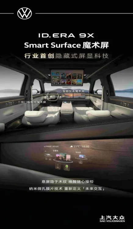 科技隐于无形,关怀触手可及。ID. ERA 9X首次搭载行业领先的Smart Surface魔术屏技术,重新定义人车交互的视觉美学与实用逻辑。其采用微孔膜片工艺,在屏幕关闭时与内饰材质完美融合,实现“只见材质不见屏幕”的隐形式美感;点亮后画面清晰通透,无纹理干扰,兼顾科技感与整体