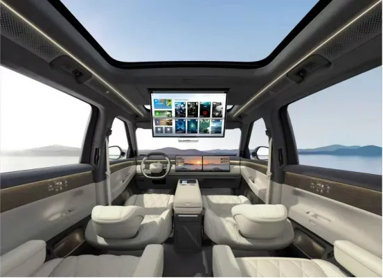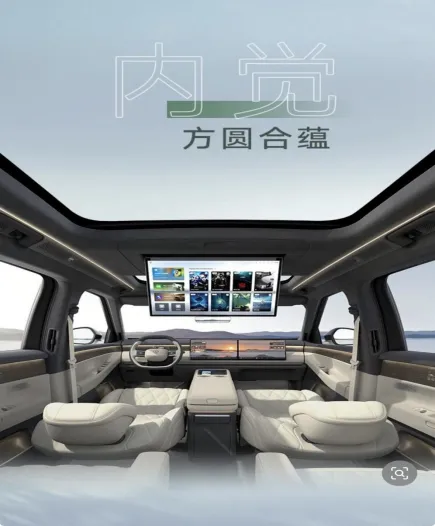 内饰以“方圆合蕴”为理念,15.6英寸双联屏、21.4英寸后排吸顶大屏搭配12.8米环舱氛围灯,打造出兼具科技感与温馨感的旗舰座舱,无论是日常代步还是家庭出行,都能享受沉浸式舒适体验。