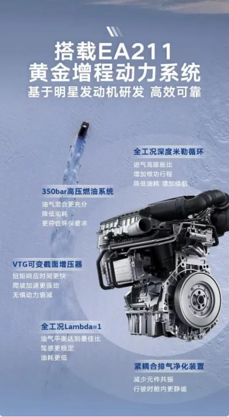 动力上,搭载EA211黄金增程器,搭配宁德时代65.2kWh大电池,CLTC纯电续航超400km,彻底告别里程焦虑,市区通勤纯电够用,长途出行从容无忧。