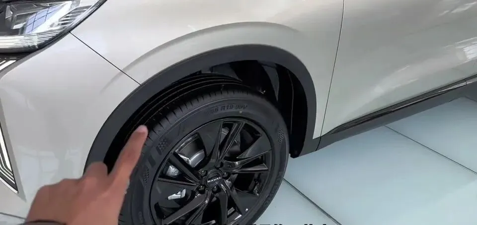 视频中这辆车是一款淡灰色,也是一款1.5T车型,它的轮毂是这个熏黑的19英寸,包括车窗周围也是这种亮黑色装饰条。