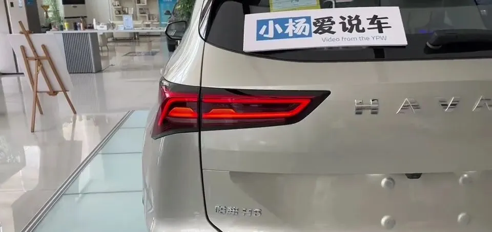 它的车尾取消了第三代车型贯穿式尾灯,中间呢,这是哈弗的一个全新的logo,我来看一下他这个尾灯,整体点亮之后,这个精致程度做的也是比较可以的。