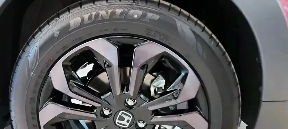 “展示车辆轮胎,黑色轮毂搭配Dunlop轮胎。”