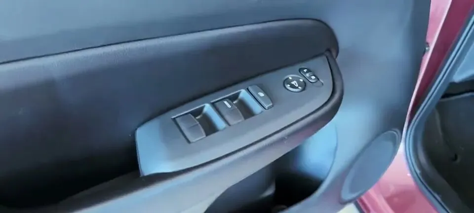 “展示车辆前排车门内饰,包括车窗控制按钮和扬声器。”