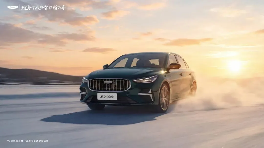 第五代吉利帝豪采用直瀑式镀铬格栅设计,LED前大灯内部具有上下两条LED灯带,前保险杠两侧仿进气口区域设计有双L形装饰。车身侧面采用上扬式腰线,配备传统造型车门外拉手,提供17英寸和18英寸铝合金轮辋选择,车身尺寸为4815/1885/1480mm,轴距达2755mm,相比老款大幅增加。