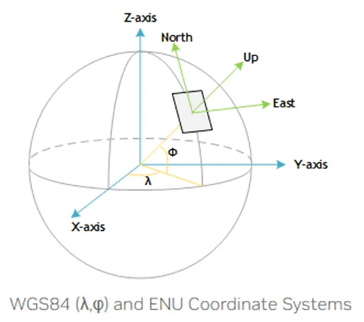• 核心定义:以固定参考点(通常为车辆定位天线初始位置)为原点的局部平面直角坐标系,自动驾驶主流使用ENU坐标系:X轴东向、Y轴向、Z轴天向(垂直地面向上),右手定则;航空领域常用NED坐标系(X轴北向、Y轴东向、Z轴地向),单位均为米(m)。