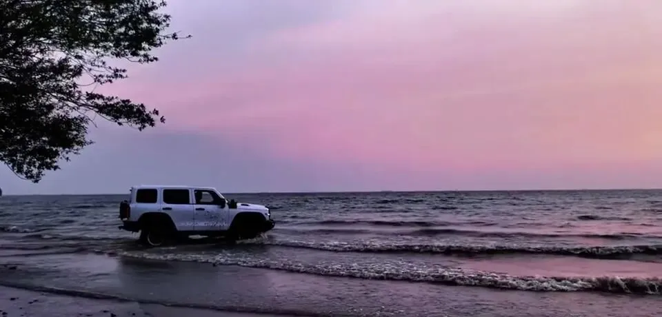 白色坦克300在海边行驶