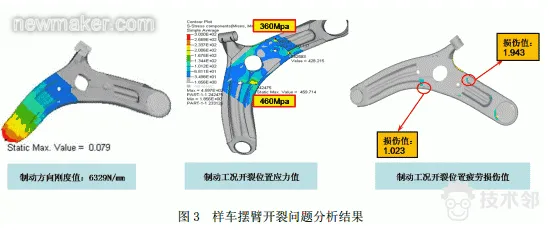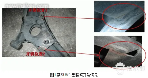 强度分析结果表明开裂的主要原因是摆臂下盖板与上盖板搭接尺寸较小所致,主要通过优化下盖板的尺寸进行解决问题,但下盖板与上盖板搭接过多的话会引起三个接附点区域应力集中,导致开裂转移,因此下盖板结构优化到什么程度同时又不会引起其他地方应力升高导致开裂就成了解决问题的关键所在。