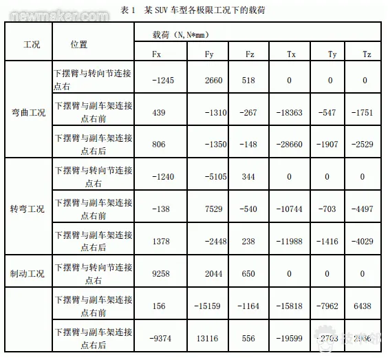本次分析多体动力学模型包括前悬架系统、动力总成系统、转向系统、稳定杆、后悬架系统以及车体,其中车体为刚体,动力总成简化为具有转动惯量的集中质量,悬架系统弹簧、衬套以及缓冲块的刚度以及阻尼都是实际样车测得的数据。根据样车襄阳实际道路可靠性试验情况输出摆臂典型的三个极限工况下的载荷,极限工况主要有颠簸工况、转弯工况、制动工况,各个极限工况的载荷见表1。