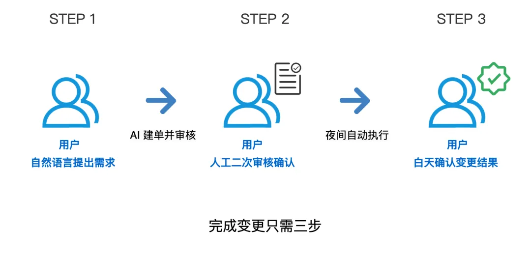 中间的现网分析、参数获取、命令生成、风险通告、变更执行等所有环节,均由 AI 和自动化系统完成。人工只需要在需求提出、变更单复核和结果确认三个节点参与——毕竟,最终的责任还在人身上。就这样,一个完整的变更,完成了。