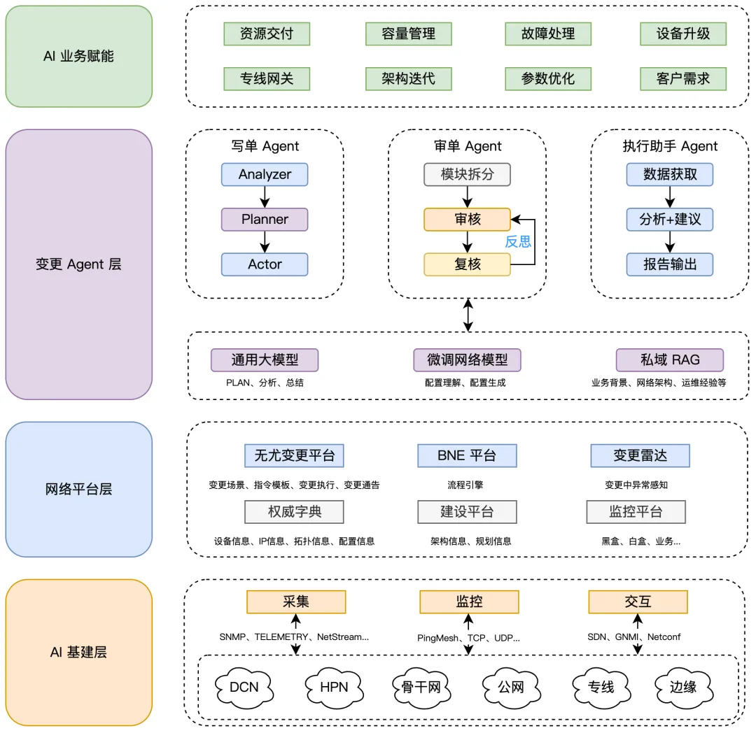 网络平台层:是智能体获取数据、交互操作的自动化平台,也是变更能力的承载底座。其中变更直接相关的核心平台包括: