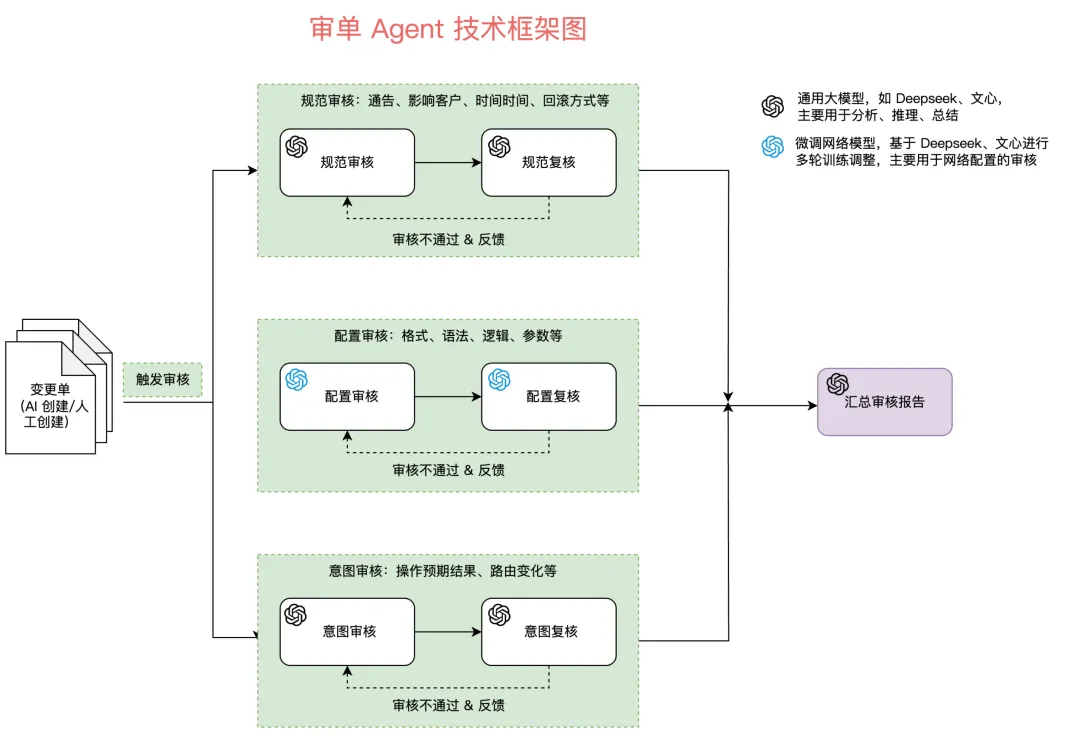 规范审核、配置审核、意图审核解耦,通用大模型审核规范和意图,微调大模型审核配置;