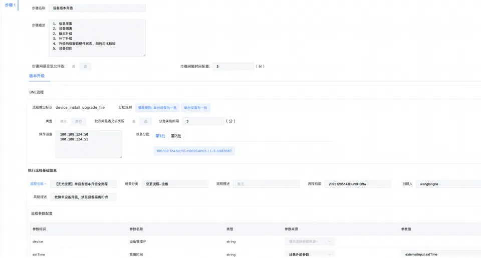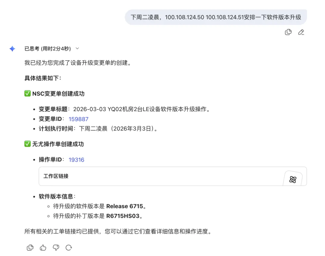 当运维同学需要对一批设备进行变更升级时,只需要输入「下周二凌晨,100.108.124.50 100.108.124.51 安排一下软件版本升级」。