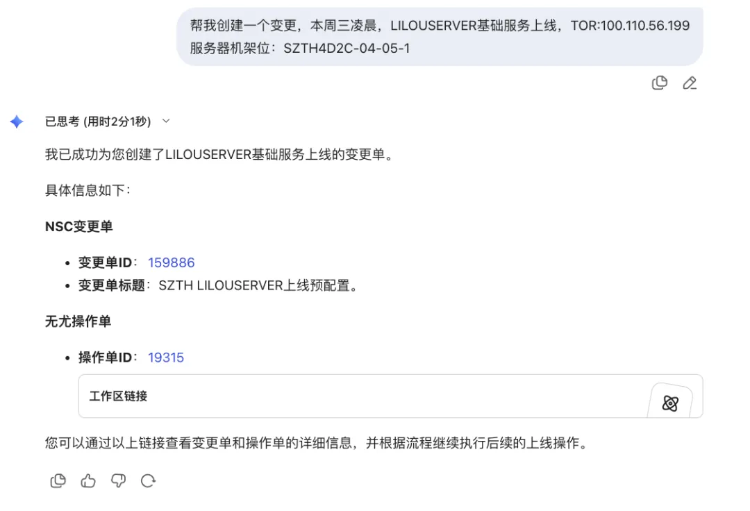 当工程同学需要部署一个网关时,只需要输入「帮我创建一个变更,本周三凌晨,LILOUSERVER 基础服务上线,TOR:100.110.56.199 服务器机架位:SZTH4D2C-04-05-1」。Agent 会首先去理解什么是 LILOUSERVER,上线这样一个基础服务需要通告哪些内容,使用哪个变更场景,选择好后再去准备具体的无尤变更单,最终完成创建。