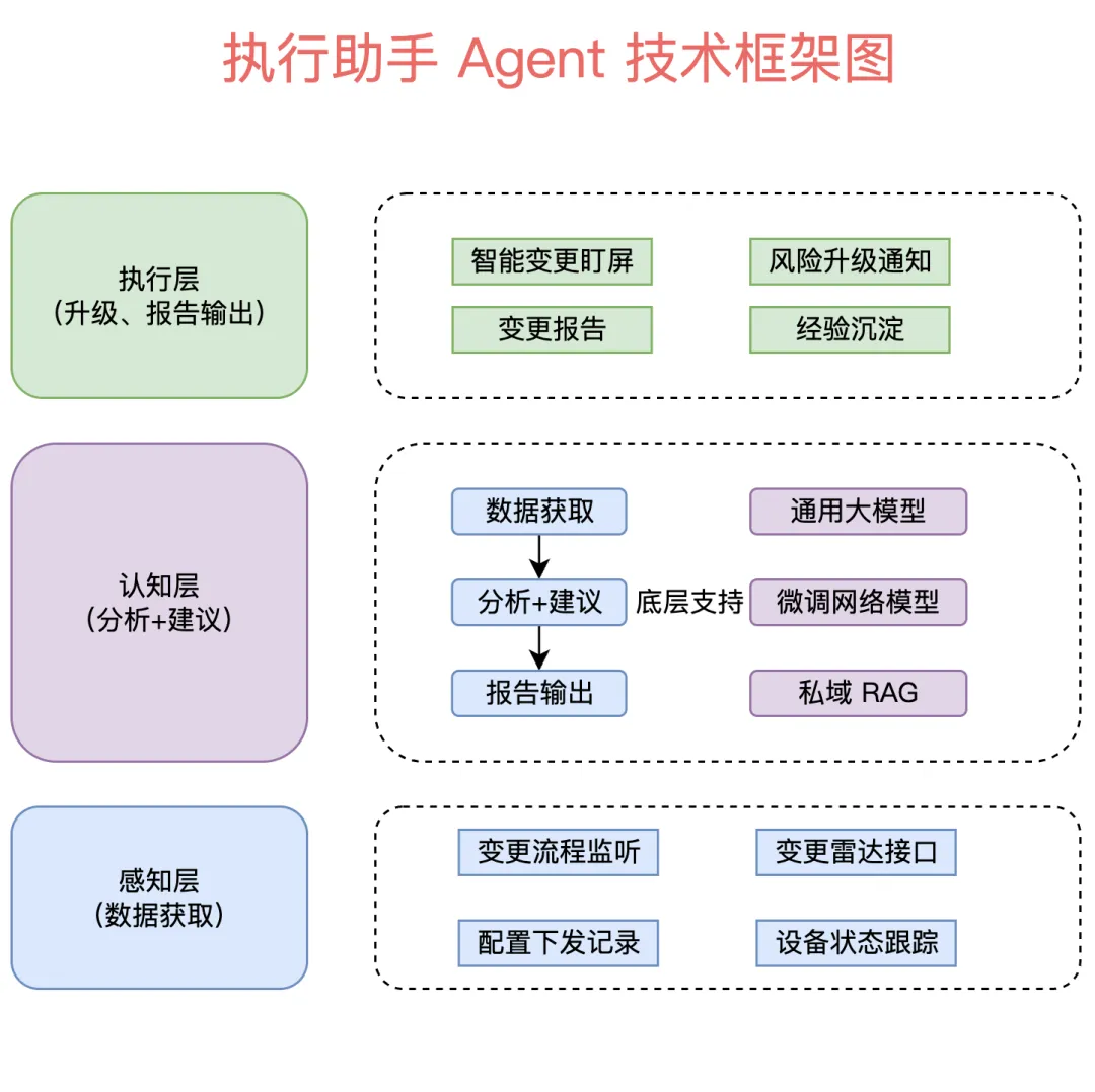 3CmxGraphModel%3E%3Croot%3E%3CmxCell%20id%3D%220%22%2F%3E%3CmxCell%20id%3D%221%22%20parent%3D%220%22%2F%3E%3CmxCell%20id%3D%222%22%20value%3D%22%E8%AE%A4%E7%9F%A5%E5%B1%82%26lt%3Bdiv%26gt%3B%EF%BC%88%E5%88%86%E6%9E%90%2B%E5%BB%BA%E8%AE%AE%EF%BC%89%26lt%3B%2Fdiv%26gt%3B%22%20style%3D%22rounded%3D1%3BwhiteSpace%3Dwrap%3Bhtml%3D1%3BfillColor%3D%23e1d5e7%3BstrokeColor%3D%239673a6%3BfontFamily%3DFZJunHJW_Zhun%3B%22%20vertex%3D%221%22%20parent%3D%221%22%3E%3CmxGeometry%20x%3D%22220%22%20y%3D%2280%22%20width%3D%22130%22%20height%3D%22140%22%20as%3D%22geometry%22%2F%3E%3C%2FmxCell%3E%3CmxCell%20id%3D%223%22%20value%3D%22%E6%84%9F%E7%9F%A5%E5%B1%82%26lt%3Bdiv%26gt%3B%EF%BC%88%E6%95%B0%E6%8D%AE%E8%8E%B7%E5%8F%96%EF%BC%89%26lt%3B%2Fdiv%26gt%3B%22%20style%3D%22rounded%3D1%3BwhiteSpace%3Dwrap%3Bhtml%3D1%3BfillColor%3D%23dae8fc%3BstrokeColor%3D%236c8ebf%3BfontFamily%3DFZJunHJW_Zhun%3B%22%20vertex%3D%221%22%20parent%3D%221%22%3E%3CmxGeometry%20x%3D%22220%22%20y%3D%22240%22%20width%3D%22130%22%20height%3D%2280%22%20as%3D%22geometry%22%2F%3E%3C%2FmxCell%3E%3CmxCell%20id%3D%224%22%20value%3D%22%E6%89%A7%E8%A1%8C%E5%B1%82%26lt%3Bdiv%26gt%3B%EF%BC%88%E5%8D%87%E7%BA%A7%E3%80%81%E6%8A%A5%E5%91%8A%E8%BE%93%E5%87%BA%EF%BC%89%26lt%3B%2Fdiv%26gt%3B%22%20style%3D%22rounded%3D1%3BwhiteSpace%3Dwrap%3Bhtml%3D1%3BfillColor%3D%23d5e8d4%3BstrokeColor%3D%2382b366%3BfontFamily%3DFZJunHJW_Zhun%3B%22%20vertex%3D%221%22%20parent%3D%221%22%3E%3CmxGeometry%20x%3D%22220%22%20y%3D%22-30%22%20width%3D%22130%22%20height%3D%2290%22%20as%3D%22geometry%22%2F%3E%3C%2FmxCell%3E%3CmxCell%20id%3D%225%22%20value%3D%22%22%20style%3D%22rounded%3D1%3BwhiteSpace%3Dwrap%3Bhtml%3D1%3Bdashed%3D1%3BfontFamily%3DFZJunHJW_Zhun%3B%22%20vertex%3D%221%22%20parent%3D%221%22%3E%3CmxGeometry%20x%3D%22380%22%20y%3D%22-30%22%20width%3D%22310%22%20height%3D%2290%22%20as%3D%22geometry%22%2F%3E%3C%2FmxCell%3E%3CmxCell%20id%3D%226%22%20value%3D%22%22%20style%3D%22rounded%3D1%3BwhiteSpace%3Dwrap%3Bhtml%3D1%3Bdashed%3D1%3BfontFamily%3DFZJunHJW_Zhun%3B%22%20vertex%3D%221%22%20parent%3D%221%22%3E%3CmxGeometry%20x%3D%22380%22%20y%3D%2280%22%20width%3D%22310%22%20height%3D%22140%22%20as%3D%22geometry%22%2F%3E%3C%2FmxCell%3E%3CmxCell%20id%3D%227%22%20value%3D%22%22%20style%3D%22edgeStyle%3DorthogonalEdgeStyle%3Brounded%3D0%3BorthogonalLoop%3D1%3BjettySize%3Dauto%3Bhtml%3D1%3BentryX%3D0.5%3BentryY%3D0%3BentryDx%3D0%3BentryDy%3D0%3BfontFamily%3DFZJunHJW_Zhun%3B%22%20edge%3D%221%22%20source%3D%228%22%20target%3D%2210%22%20parent%3D%221%22%3E%3CmxGeometry%20relative%3D%221%22%20as%3D%22geometry%22%3E%3CArray%20as%3D%22points%22%2F%3E%3C%2FmxGeometry%3E%3C%2FmxCell%3E%3CmxCell%20id%3D%228%22%20value%3D%22%E6%95%B0%E6%8D%AE%E8%8E%B7%E5%8F%96%22%20style%3D%22rounded%3D1%3BwhiteSpace%3Dwrap%3Bhtml%3D1%3BfillColor%3D%23dae8fc%3BstrokeColor%3D%236c8ebf%3BfontFamily%3DFZJunHJW_Zhun%3B%22%20vertex%3D%221%22%20parent%3D%221%22%3E%3CmxGeometry%20x%3D%22413.75%22%20y%3D%22100%22%20width%3D%2276.5%22%20height%3D%2220%22%20as%3D%22geometry%22%2F%3E%3C%2FmxCell%3E%3CmxCell%20id%3D%229%22%20style%3D%22edgeStyle%3DorthogonalEdgeStyle%3Brounded%3D0%3BorthogonalLoop%3D1%3BjettySize%3Dauto%3Bhtml%3D1%3BentryX%3D0.5%3BentryY%3D0%3BentryDx%3D0%3BentryDy%3D0%3BfontFamily%3DFZJunHJW_Zhun%3B%22%20edge%3D%221%22%20source%3D%2210%22%20target%3D%2211%22%20parent%3D%221%22%3E%3CmxGeometry%20relative%3D%221%22%20as%3D%22geometry%22%2F%3E%3C%2FmxCell%3E%3CmxCell%20id%3D%2210%22%20value%3D%22%E5%88%86%E6%9E%90%2B%E5%BB%BA%E8%AE%AE%22%20style%3D%22rounded%3D1%3BwhiteSpace%3Dwrap%3Bhtml%3D1%3BfillColor%3D%23dae8fc%3BstrokeColor%3D%236c8ebf%3BfontFamily%3DFZJunHJW_Zhun%3B%22%20vertex%3D%221%22%20parent%3D%221%22%3E%3CmxGeometry%20x%3D%22413.75%22%20y%3D%22140%22%20width%3D%2276.5%22%20height%3D%2220%22%20as%3D%22geometry%22%2F%3E%3C%2FmxCell%3E%3CmxCell%20id%3D%2211%22%20value%3D%22%E6%8A%A5%E5%91%8A%E8%BE%93%E5%87%BA%22%20style%3D%22rounded%3D1%3BwhiteSpace%3Dwrap%3Bhtml%3D1%3BfillColor%3D%23dae8fc%3BstrokeColor%3D%236c8ebf%3BfontFamily%3DFZJunHJW_Zhun%3B%22%20vertex%3D%221%22%20parent%3D%221%22%3E%3CmxGeometry%20x%3D%22413.75%22%20y%3D%22180%22%20width%3D%2276.5%22%20height%3D%2220%22%20as%3D%22geometry%22%2F%3E%3C%2FmxCell%3E%3CmxCell%20id%3D%2212%22%20value%3D%22%E9%80%9A%E7%94%A8%E5%A4%A7%E6%A8%A1%E5%9E%8B%22%20style%3D%22rounded%3D1%3BwhiteSpace%3Dwrap%3Bhtml%3D1%3BfillColor%3D%23e1d5e7%3BstrokeColor%3D%239673a6%3BfontFamily%3DFZJunHJW_Zhun%3B%22%20vertex%3D%221%22%20parent%3D%221%22%3E%3CmxGeometry%20x%3D%22545%22%20y%3D%22100%22%20width%3D%2295%22%20height%3D%2220%22%20as%3D%22geometry%22%2F%3E%3C%2FmxCell%3E%3CmxCell%20id%3D%2213%22%20value%3D%22%E5%BE%AE%E8%B0%83%E7%BD%91%E7%BB%9C%E6%A8%A1%E5%9E%8B%22%20style%3D%22rounded%3D1%3BwhiteSpace%3Dwrap%3Bhtml%3D1%3BfillColor%3D%23e1d5e7%3BstrokeColor%3D%239673a6%3BfontFamily%3DFZJunHJW_Zhun%3B%22%20vertex%3D%221%22%20parent%3D%221%22%3E%3CmxGeometry%20x%3D%22545%22%20y%3D%22140%22%20width%3D%2295%22%20height%3D%2220%22%20as%3D%22geometry%22%2F%3E%3C%2FmxCell%3E%3CmxCell%20id%3D%2214%22%20value%3D%22%E7%A7%81%E5%9F%9F%20RAG%22%20style%3D%22rounded%3D1%3BwhiteSpace%3Dwrap%3Bhtml%3D1%3BfillColor%3D%23e1d5e7%3BstrokeColor%3D%239673a6%3BfontFamily%3DFZJunHJW_Zhun%3B%22%20vertex%3D%221%22%20parent%3D%221%22%3E%3CmxGeometry%20x%3D%22545%22%20y%3D%22180%22%20width%3D%2295%22%20height%3D%2220%22%20as%3D%22geometry%22%2F%3E%3C%2FmxCell%3E%3CmxCell%20id%3D%2215%22%20value%3D%22%22%20style%3D%22rounded%3D1%3BwhiteSpace%3Dwrap%3Bhtml%3D1%3Bdashed%3D1%3BfontFamily%3DFZJunHJW_Zhun%3B%22%20vertex%3D%221%22%20parent%3D%221%22%3E%3CmxGeometry%20x%3D%22380%22%20y%3D%22240%22%20width%3D%22310%22%20height%3D%2280%22%20as%3D%22geometry%22%2F%3E%3C%2FmxCell%3E%3CmxCell%20id%3D%2216%22%20value%3D%22%E5%8F%98%E6%9B%B4%E6%B5%81%E7%A8%8B%E7%9B%91%E5%90%AC%22%20style%3D%22rounded%3D0%3BwhiteSpace%3Dwrap%3Bhtml%3D1%3BfillColor%3D%23dae8fc%3BstrokeColor%3D%236c8ebf%3BfontFamily%3DFZJunHJW_Zhun%3B%22%20vertex%3D%221%22%20parent%3D%221%22%3E%3CmxGeometry%20x%3D%22416.75%22%20y%3D%22