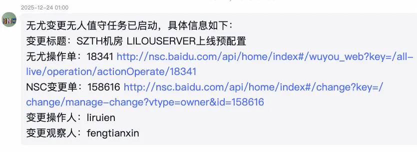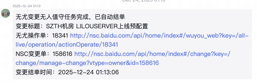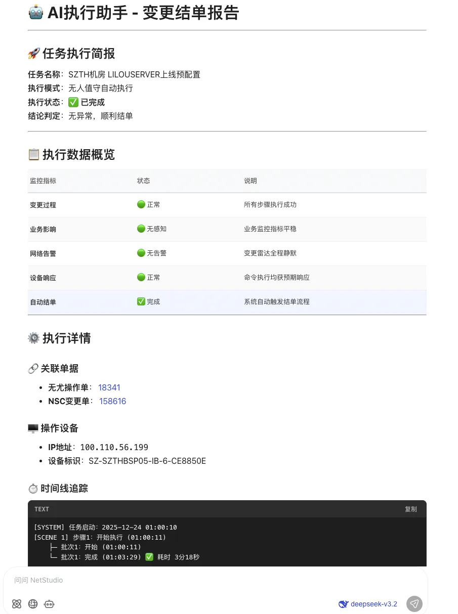 智能变更也可如此:网络工程师只需输入一句话——「下周四凌晨升级 TJZJ 的 LE 设备」或「下周五部署 SZTH 的 LILOU SERVER」——AI 便能自动完成建单、审核,深夜准时执行变更。而工程师本人,可以像乘客一样,回归正常的生活,不再需要熬过那些孤守屏幕的凌晨。