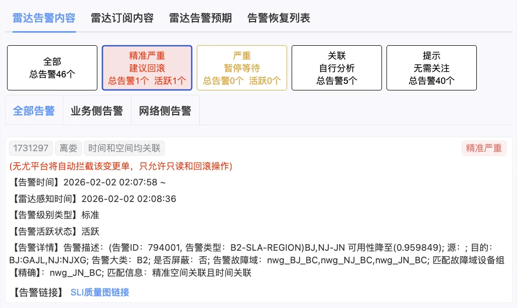 变更雷达:实时监控变更过程中的网络告警,进行智能分析与风险判别。