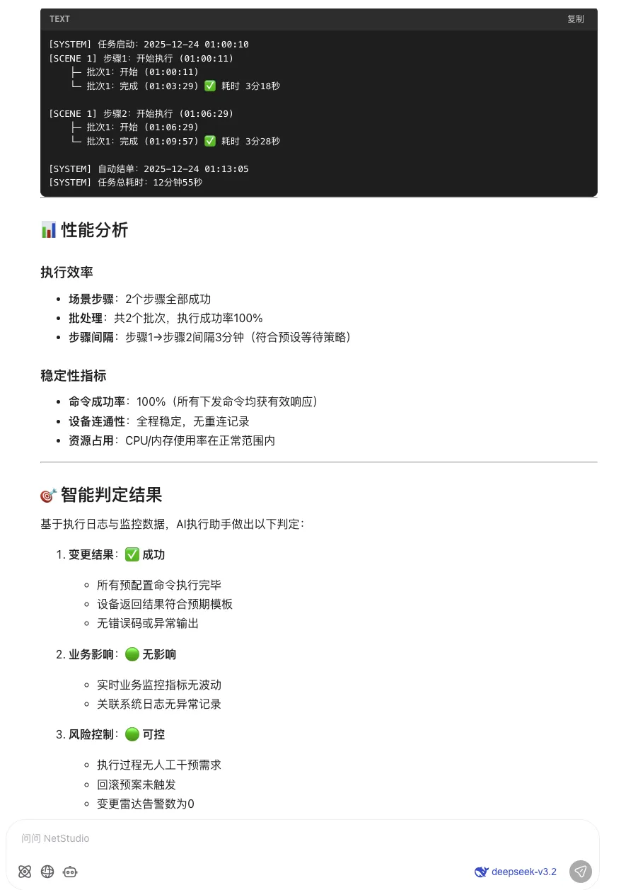 异常根因分析: 当变更雷达发出告警信号时,Agent 会迅速调取上下文,结合当前执行的指令、历史操作经验以及厂商手册(RAG),判断故障是由于「配置下发」还是「存量隐患」导致。