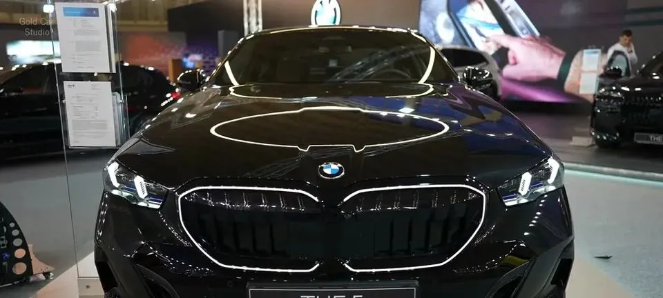 “展示宝马5系轿车的前脸设计,包括LED大灯和标志性的双肾进气格栅。”