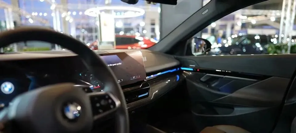 “宝马5系驾驶舱,方向盘手感舒适,仪表盘显示清晰。”
