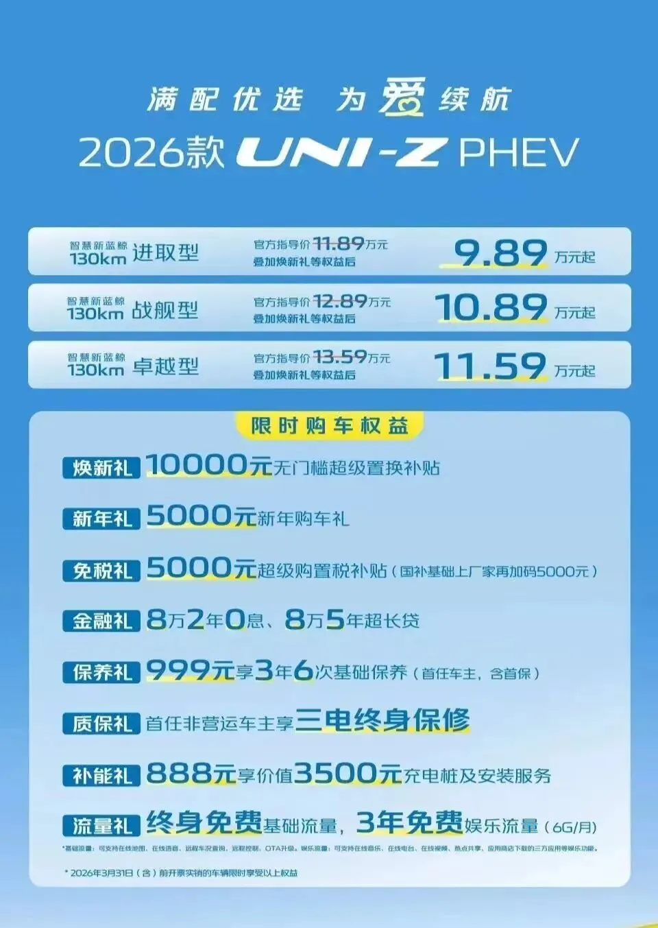 在2026年的中国新能源汽车市场,10万元级SUV赛道早已是兵家必争之地。过去,这个价位往往意味着“代步工具”的妥协——续航焦虑、配置简陋、智能化缺失。然而,最新上市的2026款长安UNI-Z PHEV,正试图打破这一固有认知。它以限时权益价9.89万元起的震撼售价,配合长达1250km的综合续航和越级的智能座舱,向市场宣告:10万级新能源SUV,不再仅仅是“能开”,更要“好开、智享、无忧”。价格“掀桌子”:9.89万起,击穿心理防线