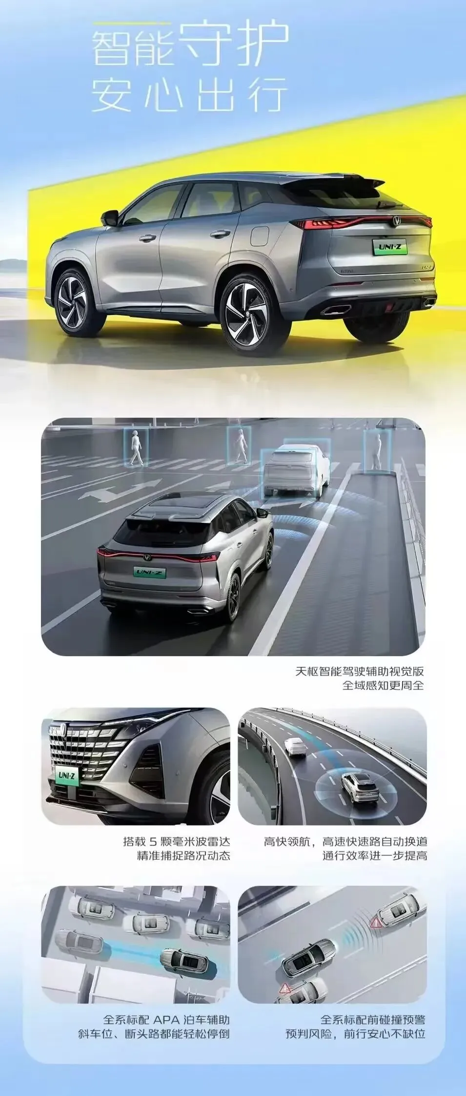 里程焦虑?不存在的。2026款UNI-Z PHEV在动力架构上进行了重磅升级,蓝鲸混动系统:1.5L高效发动机(72kW)+ 160kW大功率电机,既保证了起步的电机响应速度,又兼顾了高速巡航的燃油经济性。