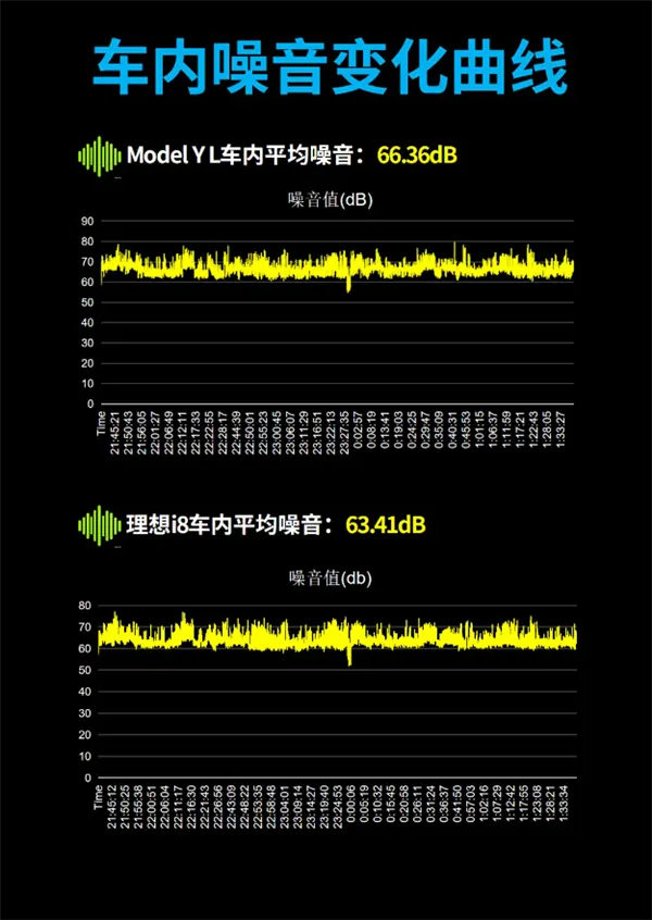 舒适体验层面,理想i8更胜一筹:车内平均噪音63.41dB,低于Model Y L的66.36dB,静谧性更优;车内平均温度11.93℃,在初始温度稍低的情况下仍高于Model Y L的10.91℃,保温性能更好,更适合低温环境出行。