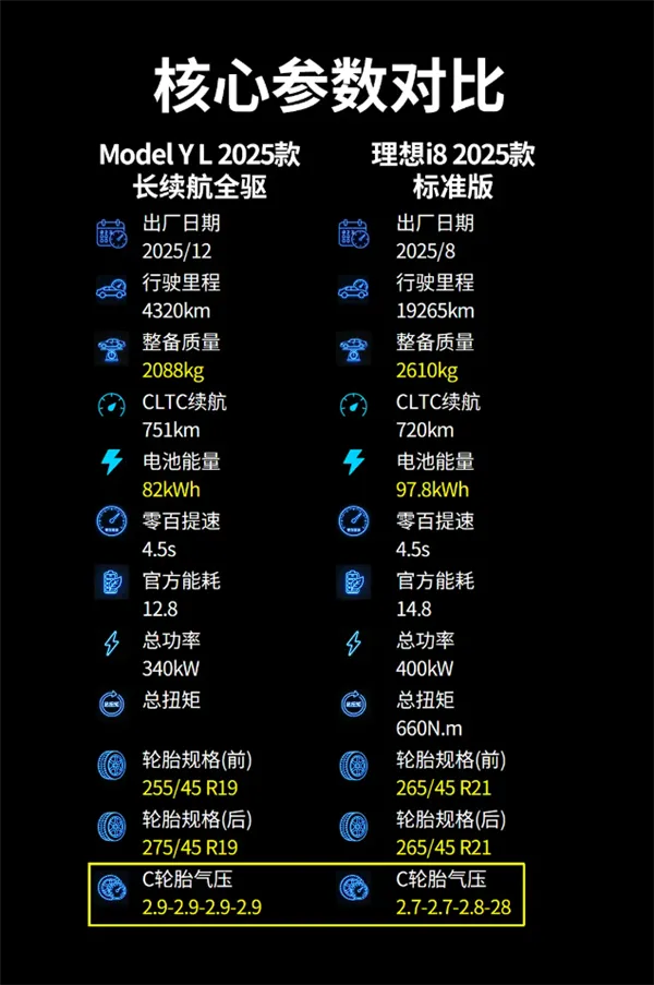 结合核心参数来看,Model Y L整备质量2088kg,电池容量82kWh;而理想i8整备质量达2610kg,搭载97.8kWh更大容量电池。