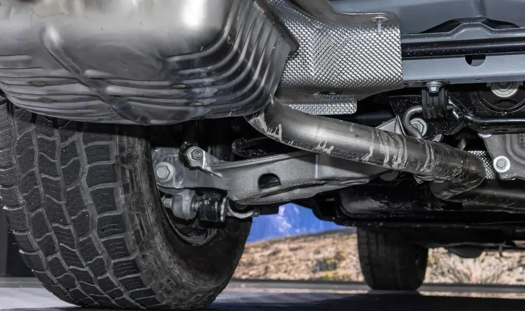 底盘调校得贼贴心。双球节前悬+铝合金下摆臂,簧下质量减了53.8%,碎石路颠得像坐过山车?不存在的。昆仑版还标配全地形胎,托森后差速器一上,泥地爬坡稳如老狗。离地间隙223mm,坑洼碎石直接碾过去,底盘装甲护得严实,再也不用担心刮到。