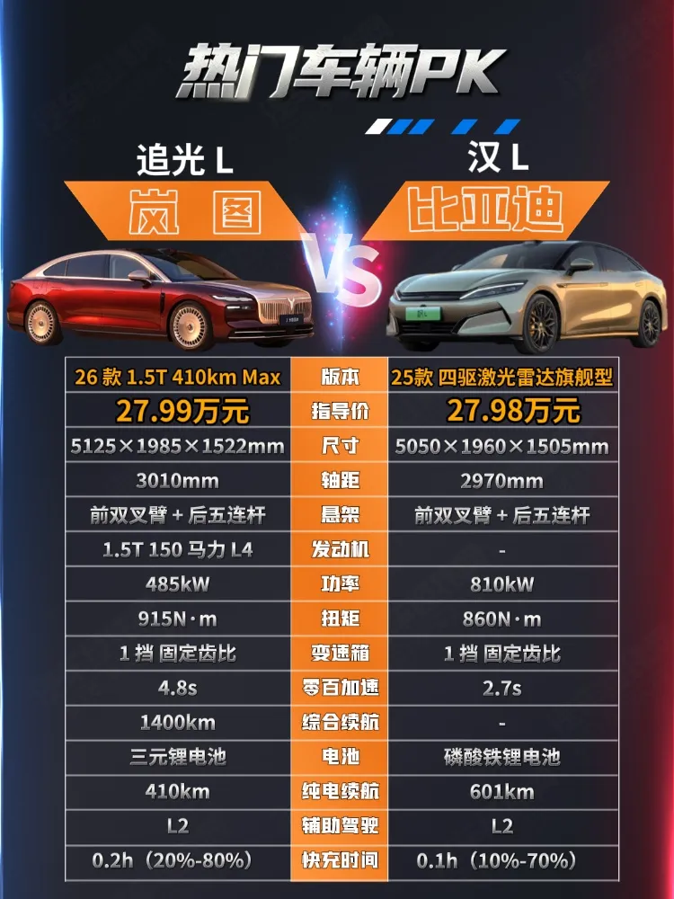 岚图追光L 2026款四驱Max售价为27.99万元,比亚迪汉L 2025款 EV 四驱激光雷达旗舰型售价为27.98万元,两款车售价接近,都面向家庭用户,那么哪一款车更值得入手呢?
