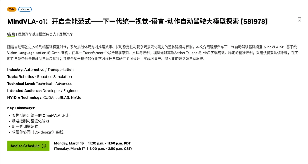 下周二下午14点至14点50分,理想汽车基座模型负责人詹锟老师将在英伟达GTC 2026上介绍理想最新一代VLA自驾大模型的进展,即MindVLA-o1。