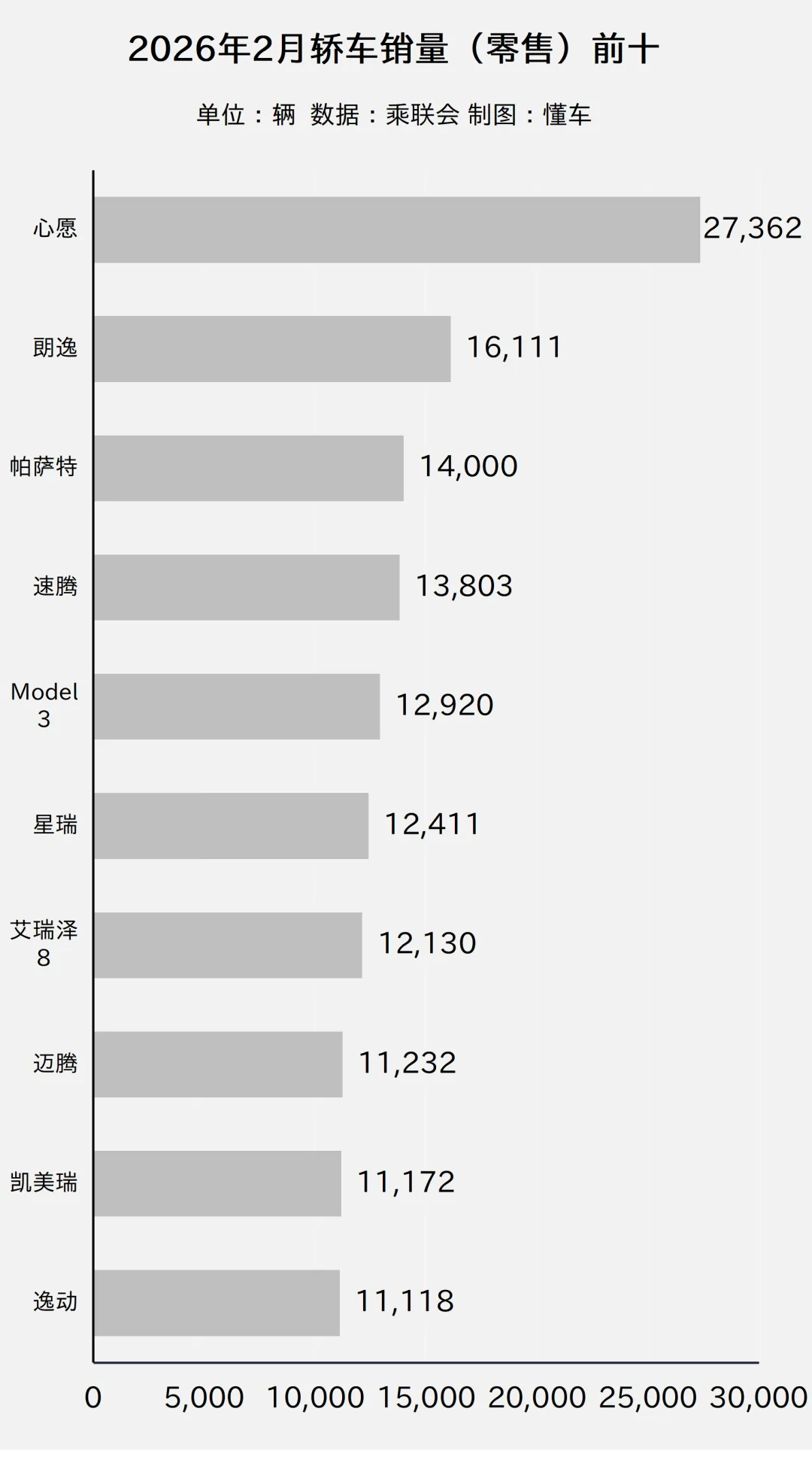 *数据源自乘联会(cpcaauto.com)汽车(乘用车)销量(零售),包含同一台车的燃油(ICE)、油混(HEV)、插电混动(PHEV)、纯电(EV)动力版本;完整的“2026年2月轿车销量前十排行榜”放在了文章最后。