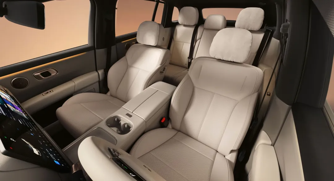 极简精致的设计与材质,提供白、灰棕、橙黄三种内饰配色,怀挡电子换挡释放中控空间,五座布局,轴距 3000mm,二排纯平地台。